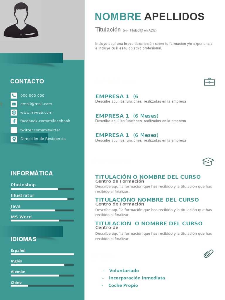 Hemos diseñado para ti diferentes plantillas para currículum vitae editables fácilmente en word para que puedas crear un curriculum inmejorable. Plantillas de curriculum gratis diseñadas para destacar tu curriculum por encima de cualquier otro candidato. Si buscas las plantillas curriculum vitae más efectivas, aquí puedes descargar gratis nuestros más de 50 modelos de cv en word muy fáciles de editar. Las plantillas de currículum gratuitas y premium y los ejemplos de cartas de. Si estás en búsqueda de empleo y necesitas plantillas de curriculum vitae , aquí encontrarás una selección de los modelos mejor valorados del.